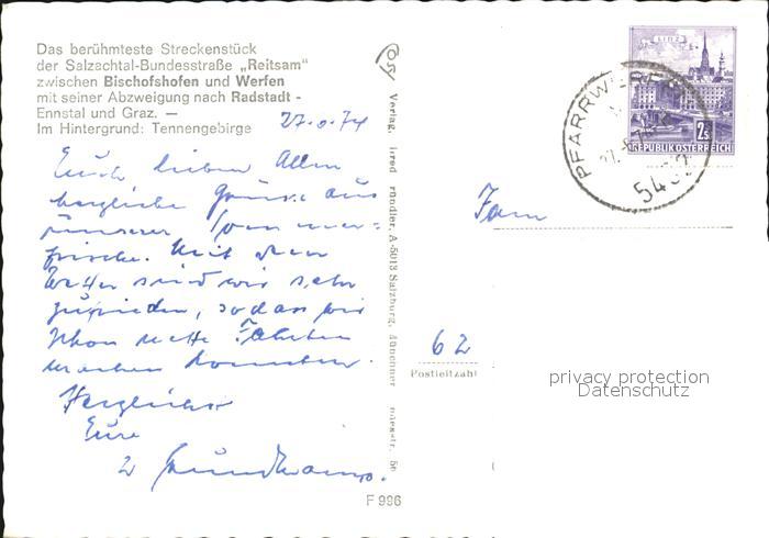 72509399 alte Postkarte Bischofshofen Werfen Salzachtal-Bundesstrasse Reitsam Tennengebirge postalisch gelaufen Erhaltung siehe scans KatCode: 11390322050404
