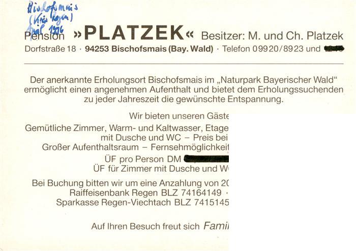 73888423 alte Postkarte Bischofsmais Pension Platzek Kirchen Panorama postalisch gelaufen Werbekarte (keine Postkarte) Erhaltung siehe scans [FriedD77] KatCode: 11110009276116