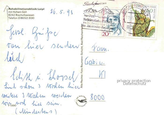 74100357 alte Postkarte Bischofswiesen Berchtesgaden Rehabilitationsklinik Loipl mit Hohem Goell Berchtesgadener Alpen postalisch gelaufen Erhaltung siehe scans [FriedD77] KatCode: 11110009172117