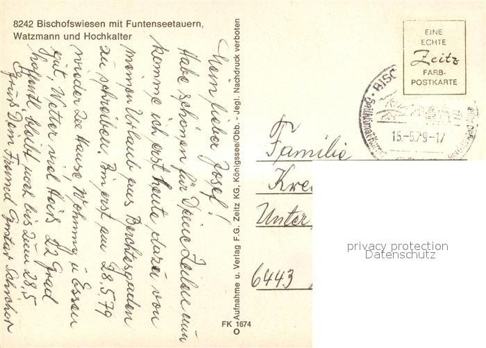 73174705 alte Postkarte Bischofswiesen Funtenseetauern Watzmann Hochkalter Fliegeraufnahme postalisch gelaufen Erhaltung siehe scans [PaolaD17] KatCode: 11110009172117
