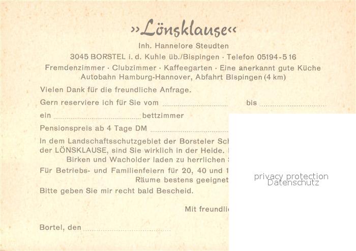 73205819 Bispingen Loens-Klause-Borstel postalisch nicht gelaufen Keine Postkarte (siehe scan) Erhaltung siehe scans [NatalD47] KatCode: 11110003358002