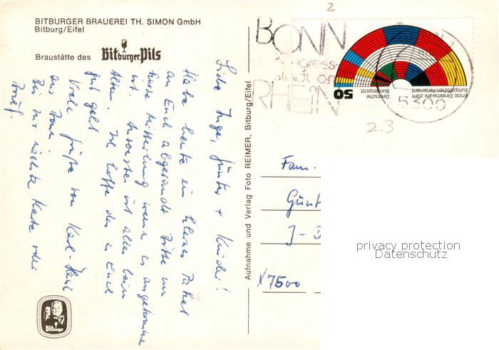 73858563 alte Postkarte Bitburg Bitburger Brauerei Simon GmbH Brunnen postalisch gelaufen Erhaltung siehe scans [FriedD77] KatCode: 11110007232018