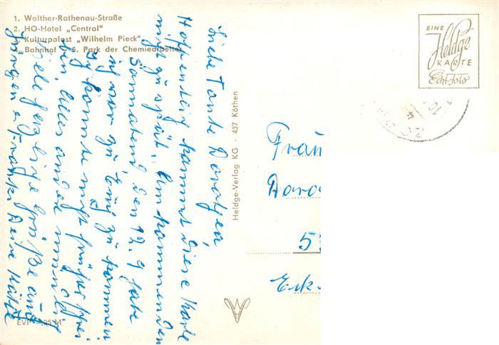 73888331 Bitterfeld Sachsen-Anhalt Walther Rathenau Strasse HO Hotel Central Kulturpalast Wilhelm Pieck Bahnhof Park der Chemiearbeiter postalisch gelaufen Erhaltung siehe scans [WerneD78] alte Postkarte Wern Katcode 11110015082015