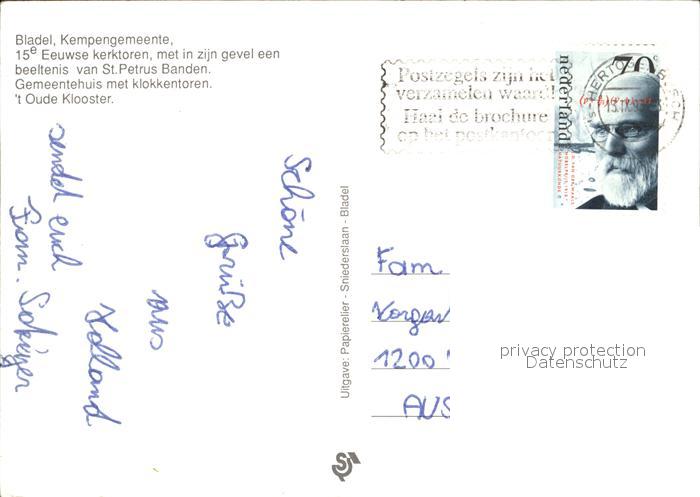 old postcard Bladel Eeuwse kerktoren mit in zijn gevel een beeltenis van St Petrus Banden Gemeentehuis met klokkentoren t Oude Klooster postalisch gelaufen Erhaltung siehe scans