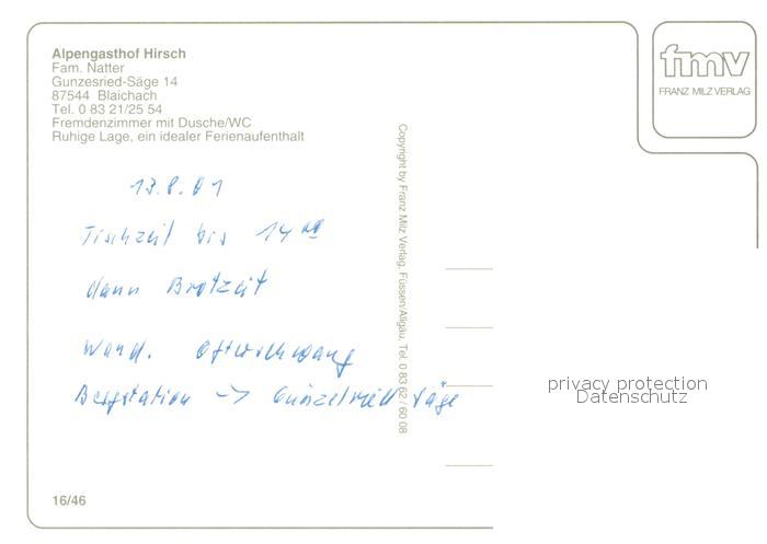 73644985 Blaichach Allgaeu Alpengasthof Hirsch Gunzesried Saege postalisch nicht gelaufen Erhaltung siehe scans [WerneD78] KatCode: 11110009780115
