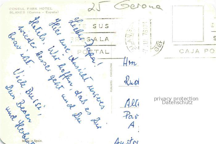 74156362 old postcard BLANES Costa Brava ES Consul-Park-Hotel Hochhaus Schwimmbad Pinien Balkonanlage Pinienwald Kueste postalisch gelaufen Erhaltung siehe scans [Karloger] KatCode: 11510