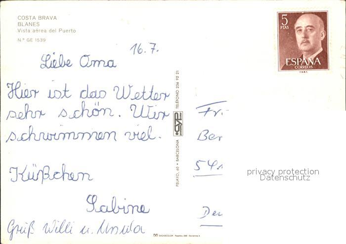 old postcard Blanes Fliegeraufnahme Hafen Costa Brava postalisch gelaufen Erhaltung siehe scans