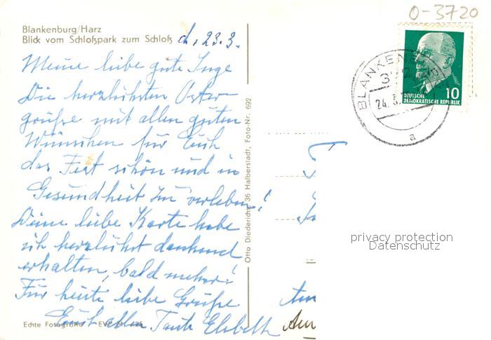 72929160 alte Postkarte Blankenburg Harz Blick vom Schlosspark zum Schloss postalisch gelaufen Erhaltung siehe scans [AndreD76] KatCode: 11110015085055
