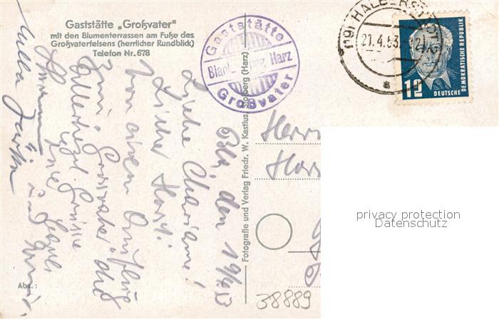 43251462 alte Postkarte Blankenburg Harz Gaststaette Grossvater am Fusse des Grossvaterfelsens postalisch gelaufen Erhaltung siehe scans [FriedD77] KatCode: 11110015085055