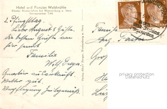 73809744 alte Postkarte Blankenburg Harz Hotel Pension Waldmuehle Kloster Michaelstein postalisch gelaufen Erhaltung siehe scans [FriedD77] KatCode: 11110015085055