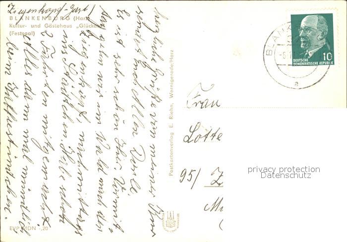 72117525 alte Postkarte Blankenburg Harz Kultur und Gaestehaus Glueck auf Festsaal postalisch gelaufen Erhaltung siehe scans KatCode: 11110015085055