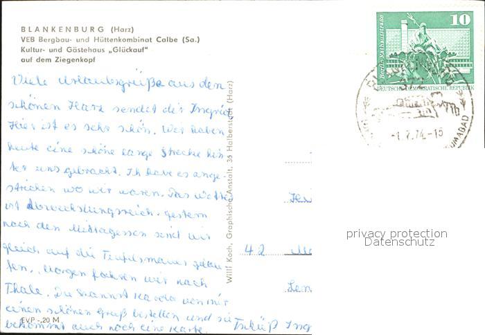 72462544 alte Postkarte Blankenburg Harz VEB Bergbau und Huettenkombinat Calbe Kulturhaus Gaestehaus auf dem Ziegenkopf postalisch gelaufen Erhaltung siehe scans KatCode: 11110015085055