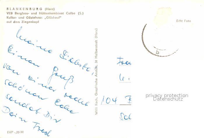 72793774 Blankenburg Harz VEB Bergbau-und Huettenkombinat Calbe postalisch nicht gelaufen Erhaltung siehe scans [AndreD76] KatCode: 11110015085055