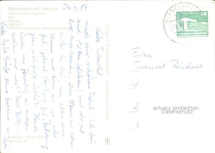 72372237 alte Postkarte Blankenhain Thueringen HO Gaststaette Parkhotel Bad Rathaus Panorama FDGB Erholungsheim Zum gueldenen Zopf postalisch gelaufen Erhaltung siehe scans KatCode: 11110016071008