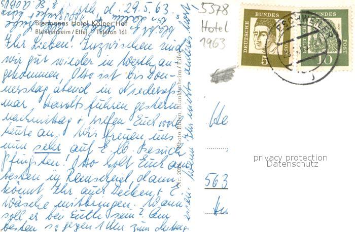 73695343 alte Postkarte Blankenheim Eifel Biermanns Hotel Koelner Hof postalisch gelaufen Erhaltung siehe scans [WerneD78] KatCode: 11110005366008