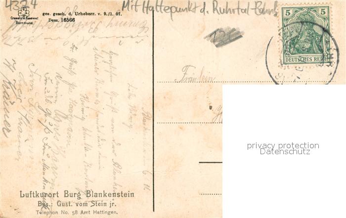 73701916 alte Postkarte Blankenstein Ruhr Burg Blankenstein v. d. Ruhrseite postalisch gelaufen Erhaltung siehe scans [LiesaD40] KatCode: 11110005954016