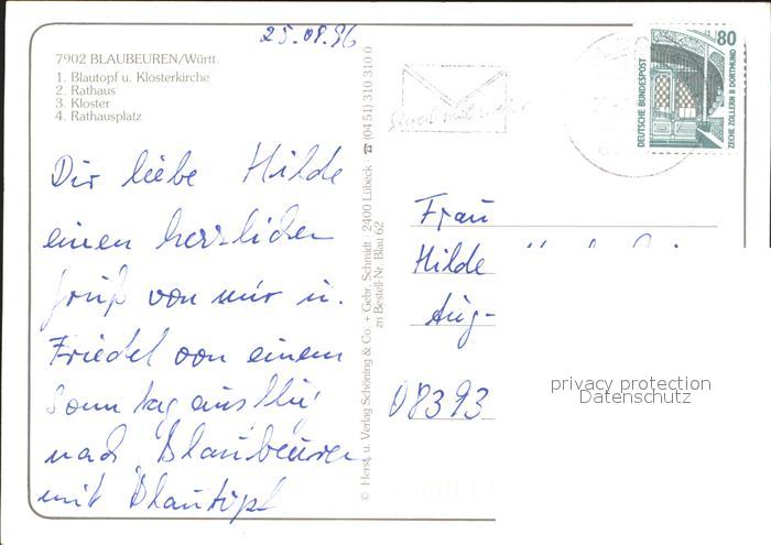 72372355 alte Postkarte Blaubeuren Blautopf Klosterkirche Rathaus Platz Kloster Geschichte postalisch gelaufen Erhaltung siehe scans KatCode: 11110008425020