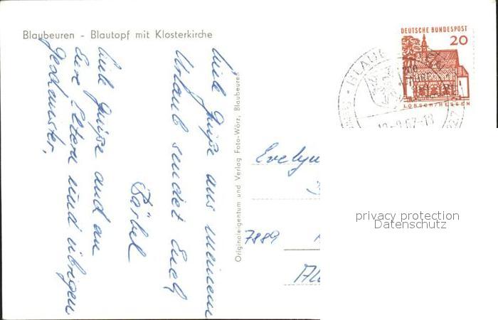 72090711 alte Postkarte Blaubeuren Blautopf mit Klosterkirche postalisch gelaufen Erhaltung siehe scans KatCode: 11110008425020
