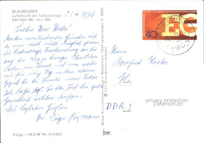 72316939 alte Postkarte Blaubeuren Fliegeraufnahme der Talkessel Lage postalisch gelaufen Erhaltung siehe scans KatCode: 11110008425020