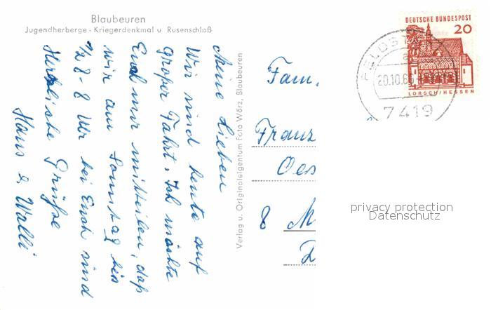 72775167 alte Postkarte Blaubeuren Jugendherberge Kriegerdenkmal Rosenschloss Panorama postalisch gelaufen Erhaltung siehe scans [KathaD81] KatCode: 11110008425020