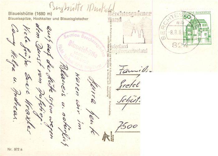 73937214 alte Postkarte Blaueishuette 1700m Hochkalter Berchtesgaden mit Blaueisspitze und Blaueisgletscher postalisch gelaufen Erhaltung siehe scans [WerneD78] KatCode: 11110009172129