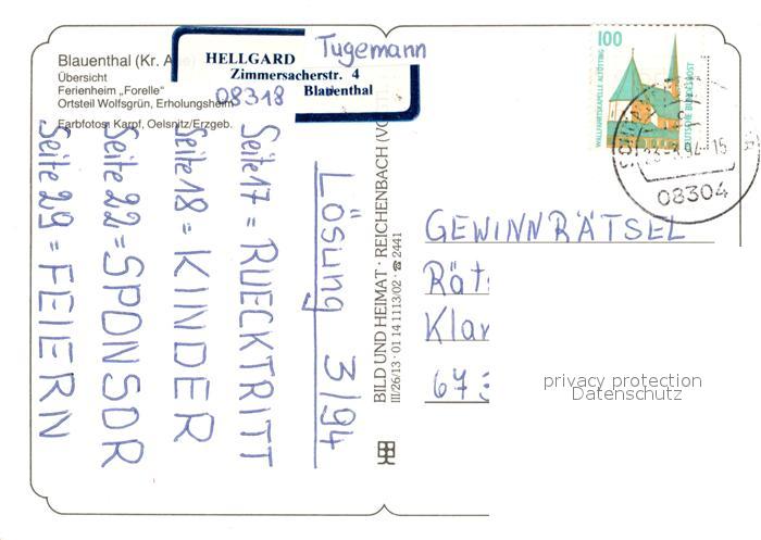 73179288 alte Postkarte Blauenthal Erzgebirge uebersicht Ferienheim Forelle OT Wolfsgruen Erholungsheim postalisch gelaufen Erhaltung siehe scans [FriedD77] KatCode: 11110014191120