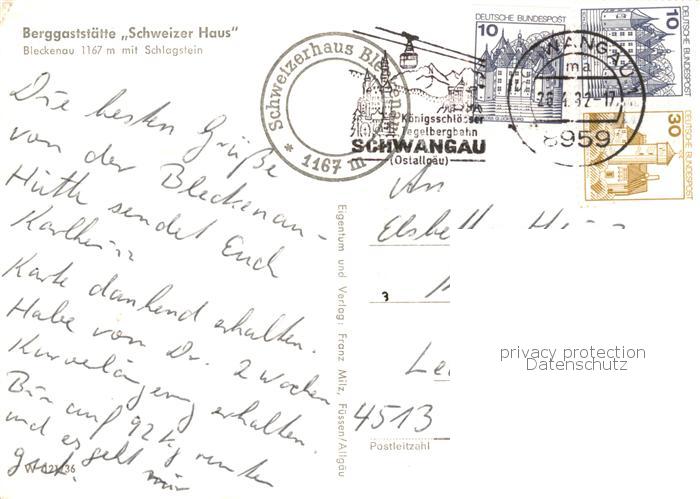 73836517 alte Postkarte Bleckenau Schwangau Berggaststaette Schweizer Haus postalisch gelaufen Erhaltung siehe scans [WerneD78] KatCode: 11110009777169