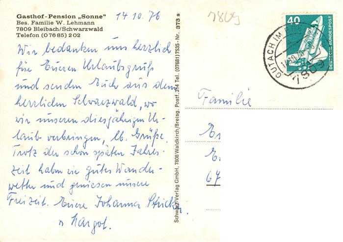 73932618 alte Postkarte Bleibach Gasthof Pension Sonne postalisch gelaufen Erhaltung siehe scans [FriedD77] KatCode: 11110008316014