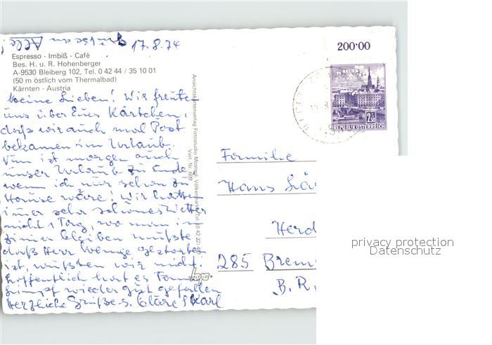72431843 alte Postkarte Bleiberg Espresso Hohenberger postalisch gelaufen Erhaltung siehe scans KatCode: 11390211020201