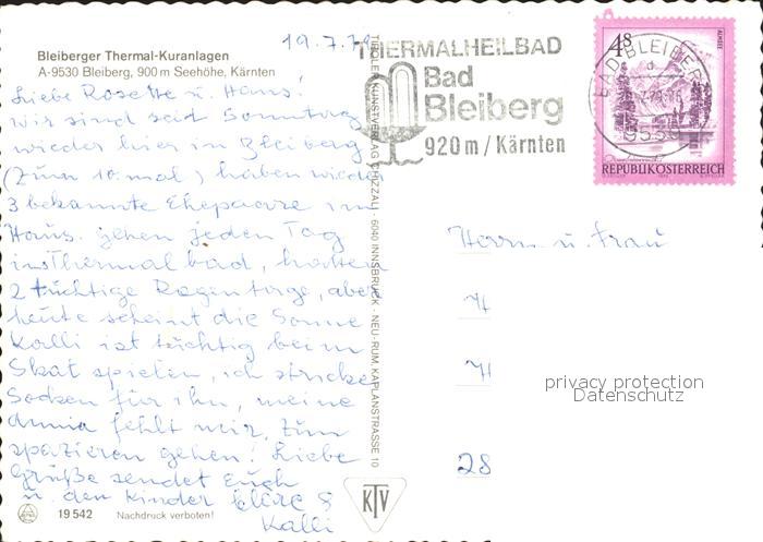 72375767 alte Postkarte Bleiberg Thermal Kuranlagen postalisch gelaufen Erhaltung siehe scans KatCode: 11390211020201
