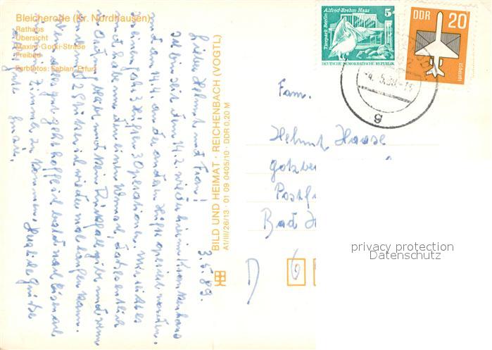 73652171 alte Postkarte Bleicherode Rathaus Panorama Maxim Gorki Strasse Freibad postalisch gelaufen Erhaltung siehe scans [WerneD78] KatCode: 11110016062002
