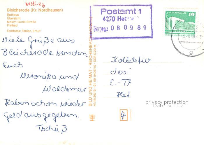 73061783 alte Postkarte Bleicherode Rathaus uebersicht Maxim Gorki Strasse Freibad Wappen postalisch gelaufen Erhaltung siehe scans [FriedD77] KatCode: 11110016062002