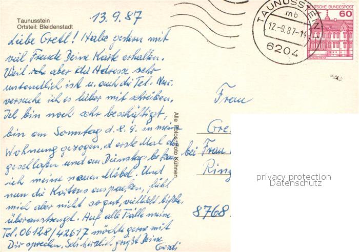 73673425 alte Postkarte Bleidenstadt Ortsansicht Kirchen Pfarrhaus Ehrenmal postalisch gelaufen Erhaltung siehe scans [FriedD77] KatCode: 11110006439015