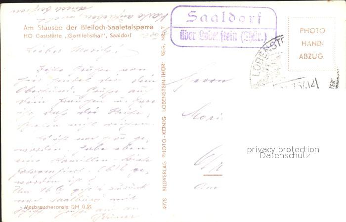 72360989 alte Postkarte Bleilochtalsperre Gaststaette Gottliebsthal Saaldorf postalisch gelaufen Erhaltung siehe scans KatCode: 11110016075098