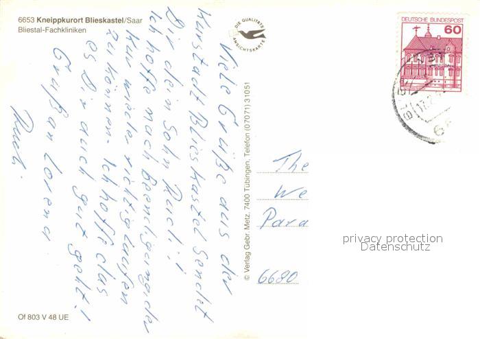 72907964 alte Postkarte Blieskastel Bliestal Fachkliniken Kneippkurort postalisch gelaufen Erhaltung siehe scans [FriedD77] KatCode: 11110010045112