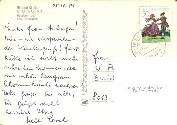 alte Postkarte Blieskastel Bliestal Kliniken Fliegeraufnahme postalisch gelaufen Erhaltung siehe scans
