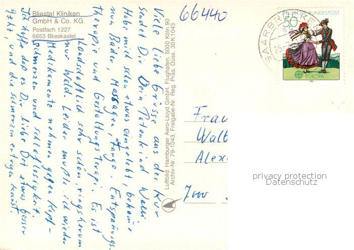 73177067 alte Postkarte Blieskastel Fliegeraufnahme Bliestal Kliniken postalisch gelaufen Erhaltung siehe scans [NatalD47] KatCode: 11110010045112