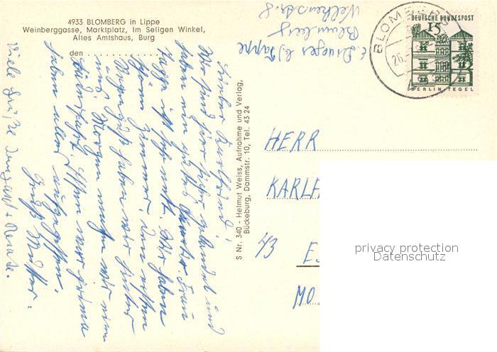 73312036 alte Postkarte Blomberg Lippe Weinberggasse Marktplatz Seligen Winkel postalisch gelaufen Erhaltung siehe scans [NatalD47] KatCode: 11110005766016