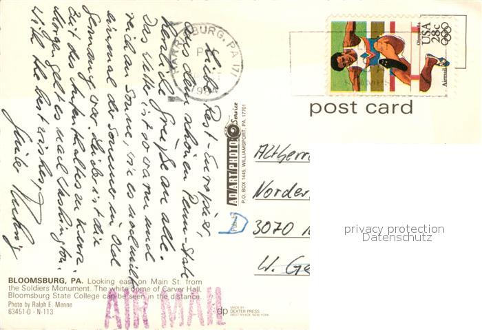 73020042 old postcard Bloomsburg Main Street Soldiers Monument postalisch gelaufen Erhaltung siehe scans [WerneD78] KatCode: 14140410000000