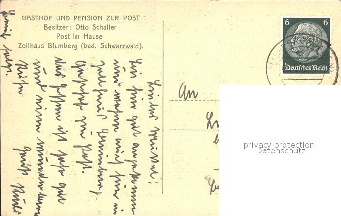 32157894 alte Postkarte Blumberg Baden Gasthof Pension zur Post postalisch gelaufen Erhaltung siehe scans KatCode: 11110008326005