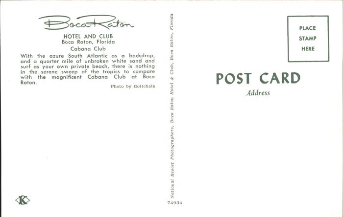 11491430 Boca Raton Hotel and Club Cabana Club Beach postalisch nicht gelaufen Erhaltung siehe scans KatCode: 14140110000000