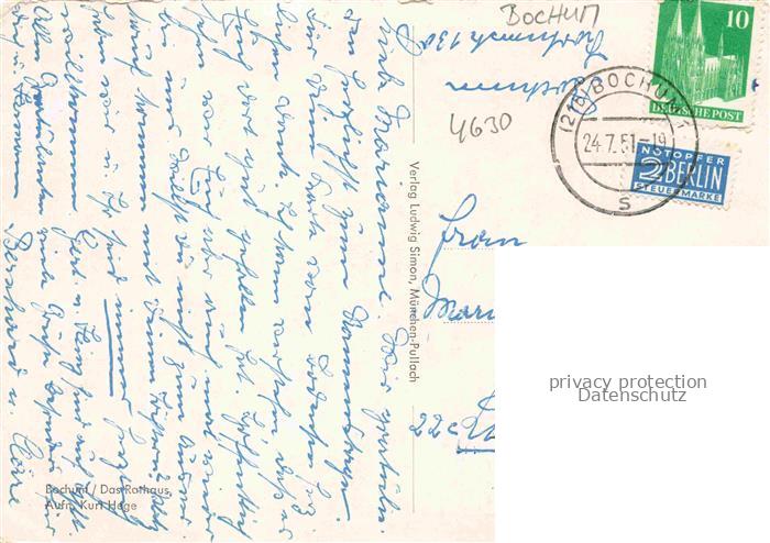 74099471 BOCHUM CITY Rathaus postalisch gelaufen Erhaltung siehe scans [WerneD78] alte Postkarte Wern Katcode 11110005911000