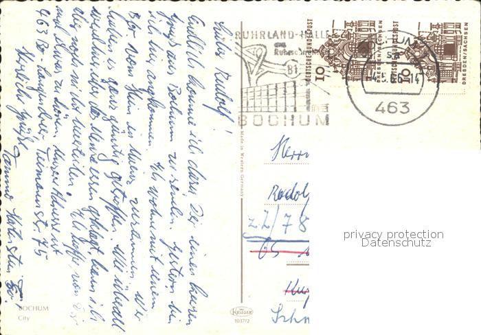 72076869 alte Postkarte BOCHUM CITY Strassenbahn Teilansicht postalisch gelaufen Erhaltung siehe scans KatCode: 11110005911000