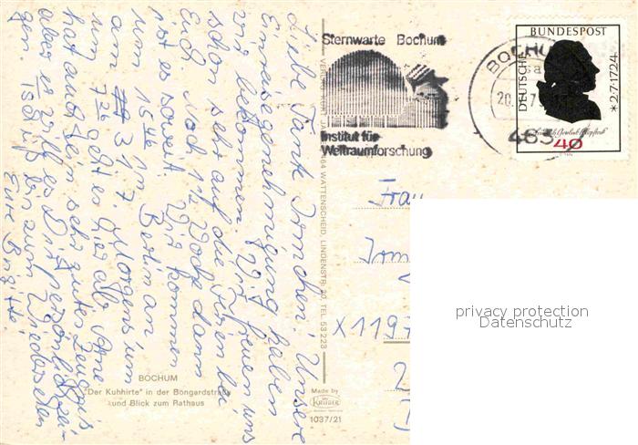 72888314 alte Postkarte Bochum Kuhhirte in der Bongardstrasse Statue Blick zum Rathaus postalisch gelaufen Erhaltung siehe scans [FriedD77] KatCode: 11110005911000