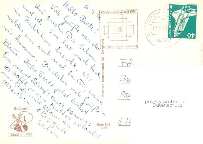 73248172 alte Postkarte Bochum Stadtbild um 1750 Ruhr Universitaet Bahnhofsplatz Nachtaufnahme postalisch gelaufen Erhaltung siehe scans [FriedD77] KatCode: 11110005911000