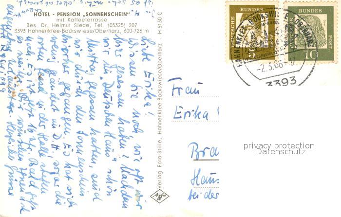 73080369 alte Postkarte Bockswiese-Hahnenklee Harz Hotel Pension Sonnenschein Kaffeeterrasse postalisch gelaufen Erhaltung siehe scans [FriedD77] KatCode: 11110003153005