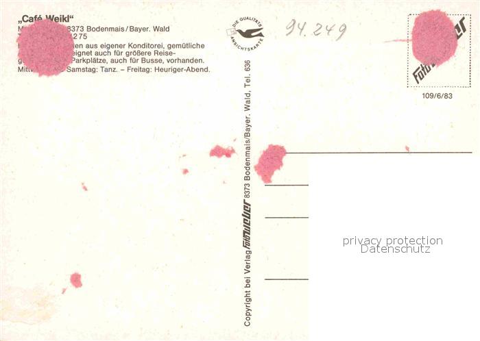 72826948 Bodenmais Cafe Weikl postalisch nicht gelaufen Erhaltung siehe scans [NatalD47] KatCode: 11110009276117