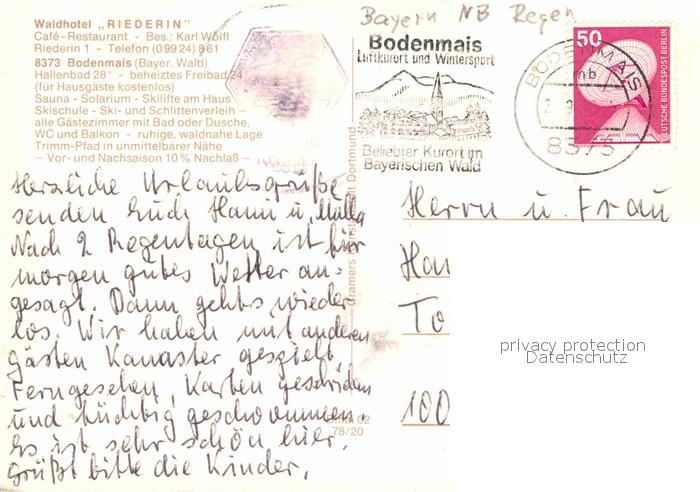 72919309 alte Postkarte Bodenmais Wald-Hotel Riederin postalisch gelaufen Erhaltung siehe scans [NatalD47] KatCode: 11110009276117