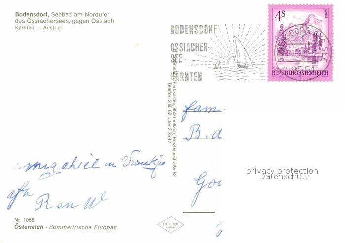 72863691 alte Postkarte Bodensdorf Ossiacher See Alpenpanorama Badestrand Angeln Segeln postalisch gelaufen Erhaltung siehe scans [FriedD77] KatCode: 11390