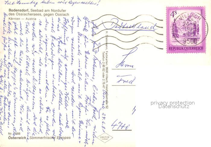 73304379 alte Postkarte Bodensdorf Ossiacher See Seebad Fliegeraufnahme Badestrand Nationalflaggen postalisch gelaufen Erhaltung siehe scans [FriedD77] KatCode: 11390